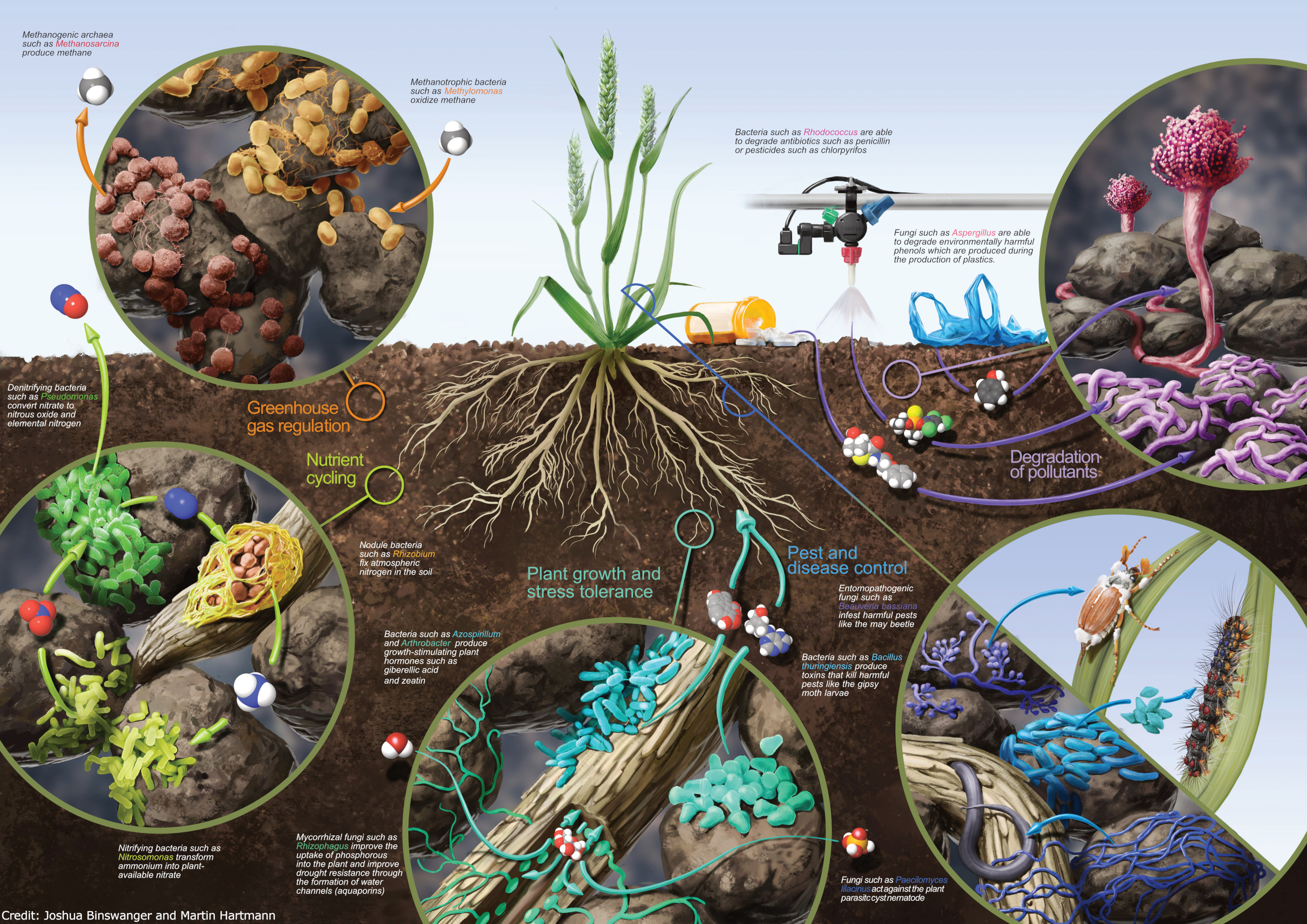 icrobial key functions in the plant-soil system. Soil microorganisms play essential roles in climate regulation, nutrient cycling, plant growth promotion and abiotic stress tolerance, pest and disease control, and pollutant degradation. Visit: www.microbiome.ch